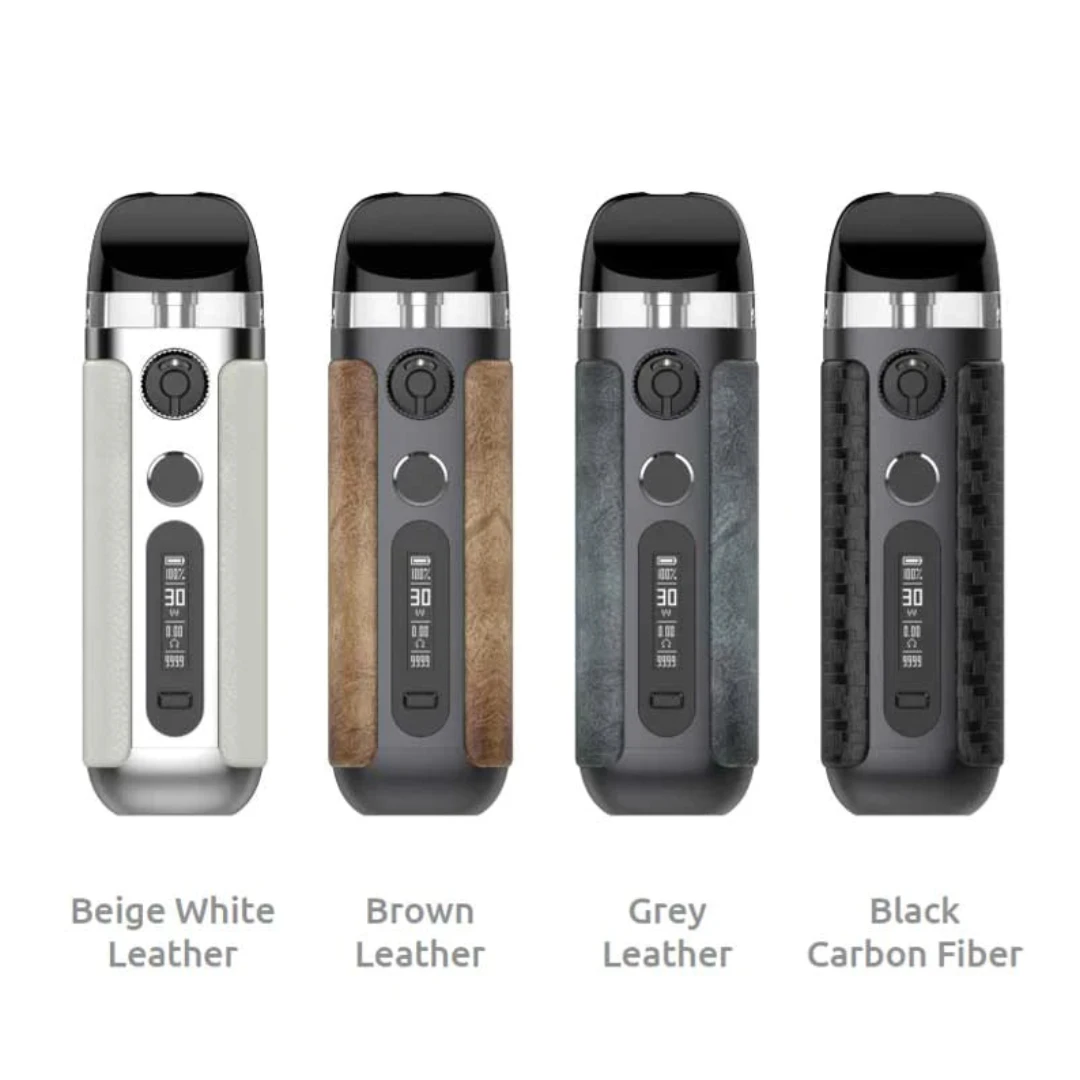 This vape by SMOK Tech is the new Novo 5 Leather series with Air-Inlet Ring, Top-Fill Design, Button/Air Switch, Novo 5 Meshed 0.7ohm MTL Pod, Variable Wattage 5-30W, 900mAh